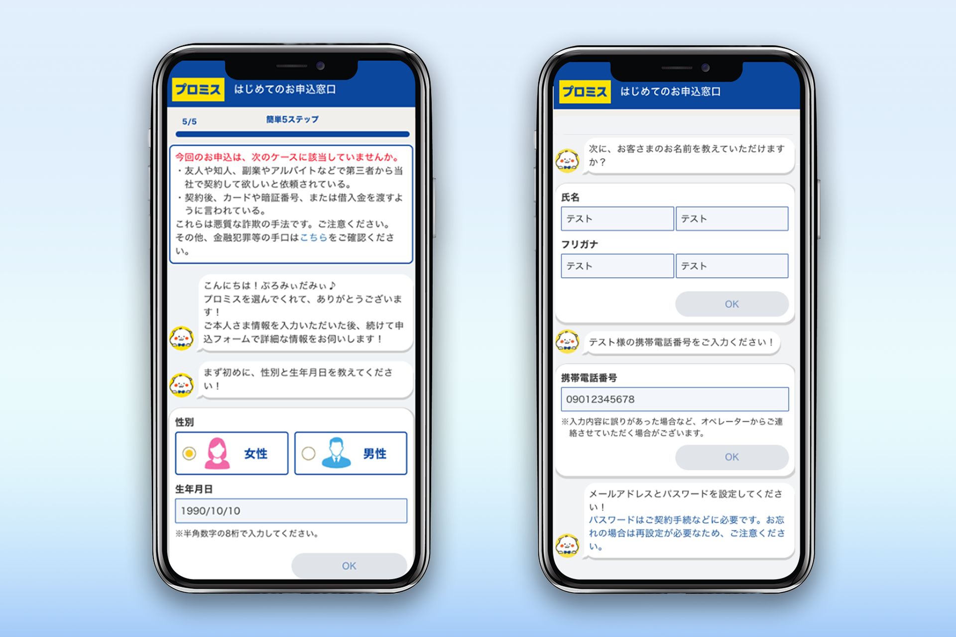 「プロミス」では、お客さまがスムーズに手続きができるよう、申込フォームの最適化を進めています。今回、「BOTCHAN EFO」を導入し、消費者金融業界では初めてとなる対話形式による申込フォームに変更することで、新たな申込体験を可能としました (※2)。